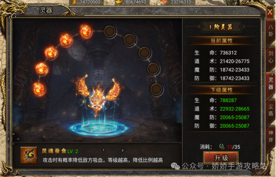 御剑八荒灵器是很重要的,可以降低敌方的吸血,在打架中为什么觉得打半天都打不死对面就是因为你们战力差不多,且每个人都有吸血,而升级灵器可以很好的抑制敌人的吸血达到秒杀的效果。