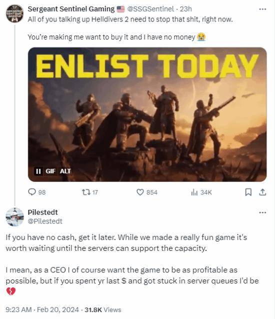 昨日,一位玩家发推表达了自己没有钱购买这款游戏的悲伤之情。工作室首席执行官兼创意总监Johan Pilestedt在评论区劝他理性消费,不要在服务器出问题时购买。