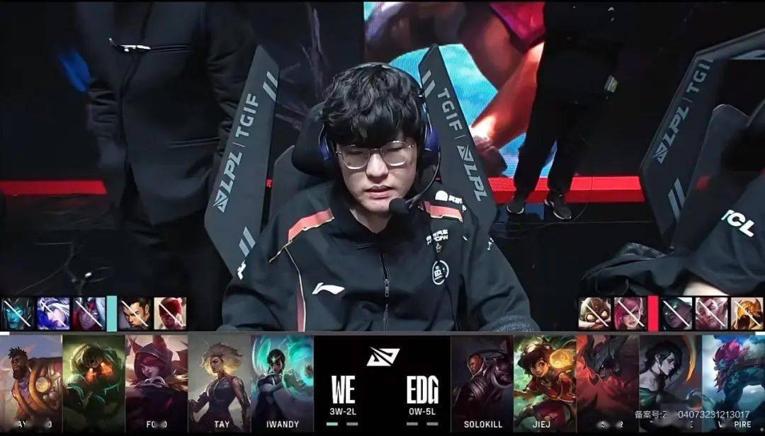 过程中Solokill的一手剑魔遭到观众调侃,中路一波团战绕后不敢进场狂砍空气,被WE推进一波的过程中怒砍辅助完成击杀,后进场再斩一人,但自家基地已经被推平,比赛结束EDG遭遇六连败。