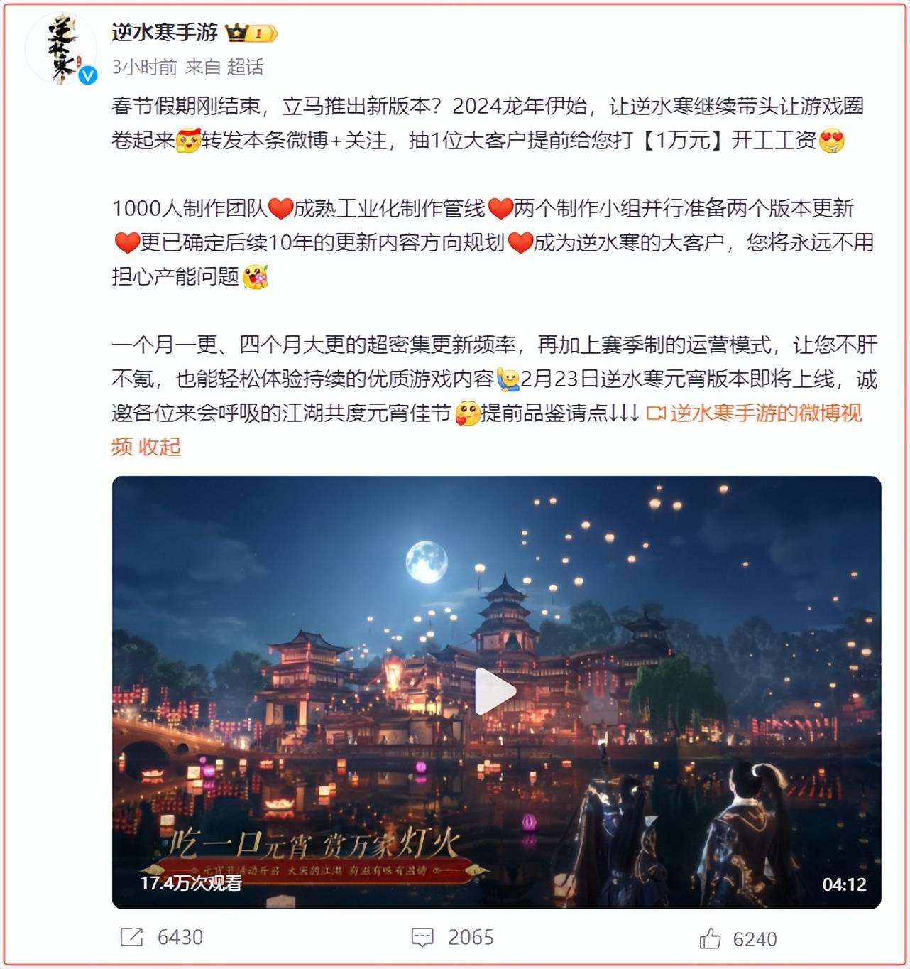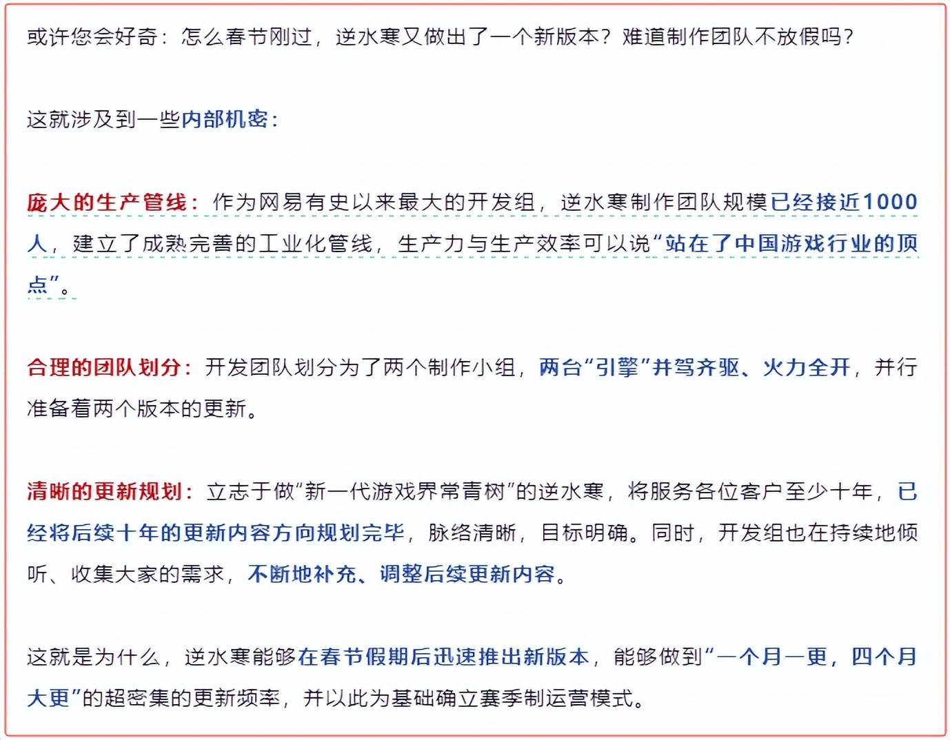 为了实现玩家们的这种需求,网易也选择了最简单直白的方式——砸更多钱、招更多人,用更强的产能,让《逆水寒》手游始终站立在中国游戏行业的顶点。