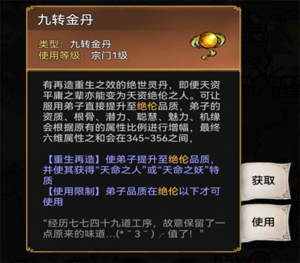 关于九转金丹的获取:在第一次炼丹大会,大概使用仙盟贡献兑换的450朵花炼丹就能换3颗九转丹,炼化过程中也有概率获得九转丹和六维提升丹药,没有五行禅的话建议九转一颗给紫的五行禅,一颗给杨安,用秦冰就不用给杨安,一颗给留着给喜欢的金水双速画,天火剑,都行。