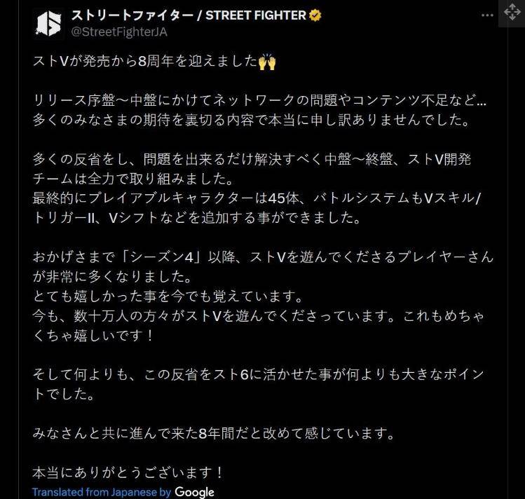 “从发布开始到中期,都存在网络问题、内容缺乏等问题,”StreetfighterJA 账户在推特上写道(通过RPS)。 “对于内容没有达到你们许多人的期望,我们深表歉意。从游戏中期到结束,《街头霸王5》开发团队进行了大量的自我反思,并努力尽可能地解决问题。”