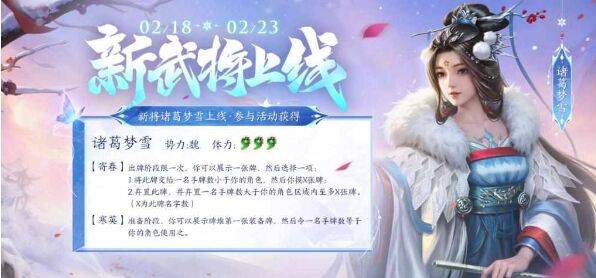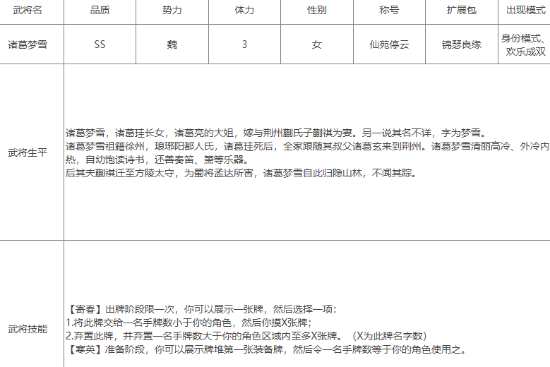 诸葛梦雪是3血2技能魏将,【寄春】 出牌阶段限一次,你可以展示一张牌并选择一项:1.将此牌交给一名手牌数小于你的角色并摸X张牌;2.弃置此牌并弃置一名手牌数大于你的角色区域内的至多X张牌(X为此牌牌名字数)。【寒英】 准备阶段,你可以展示牌堆顶的一张装备牌,令一名手牌数等于你的角色使用之。