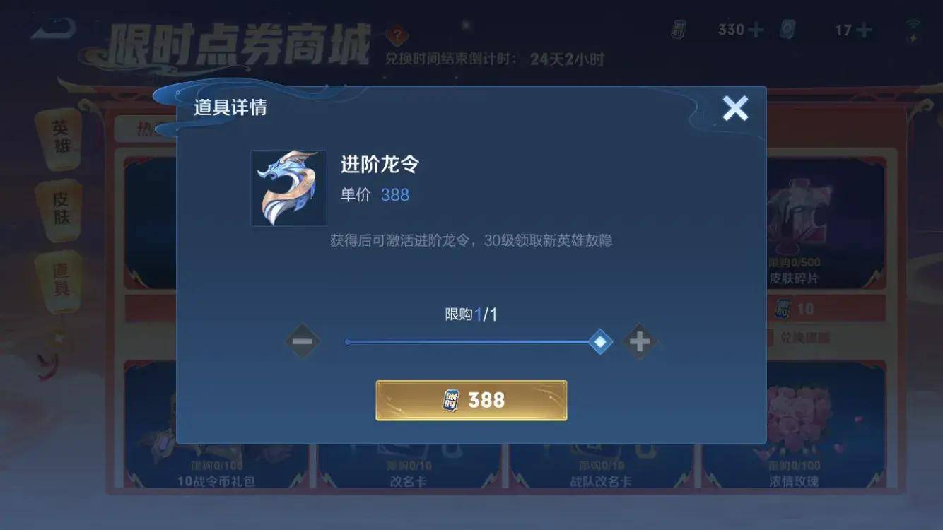 此时会发现,换一款史诗皮肤多出268限时点券,不足以解锁“进阶龙令”,同时又不够兑换传说皮肤,需要消耗自己的点券。