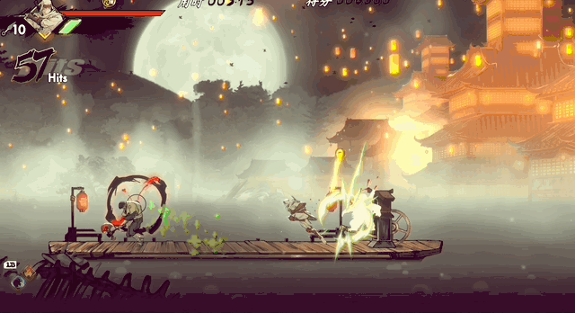 在这之后,胧之村由于反派组织ENE-CORP的攻打而陷入了一片火海,四处的断壁残垣与之前的美好又形成了鲜明的对比。而试玩版的另一个街机模式关卡里,乔武藏则要进入一个庆典中的城市,在渡船上进入城市的时候,会先看到从中飞来的无数天灯。一边是美不胜收的绝景,另一边则是在浴血厮杀的乔武藏,两者同处一个画面中时,游戏的英文副标题Art of Vengeance所蕴含的暴力美学得到了完美地诠释。