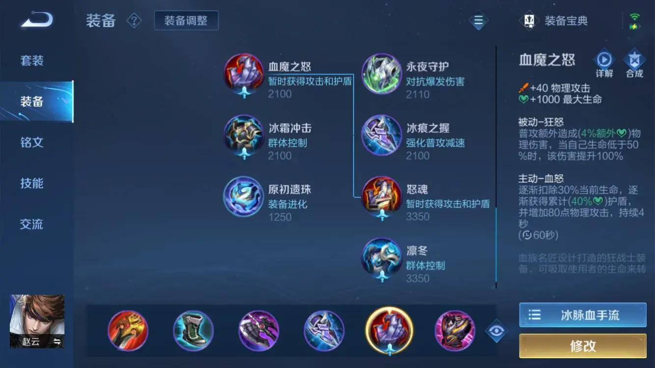 除了玩法,赵云的出装铭文也很重要,强度表现最稳定的是“冰脉血手流”玩法。
