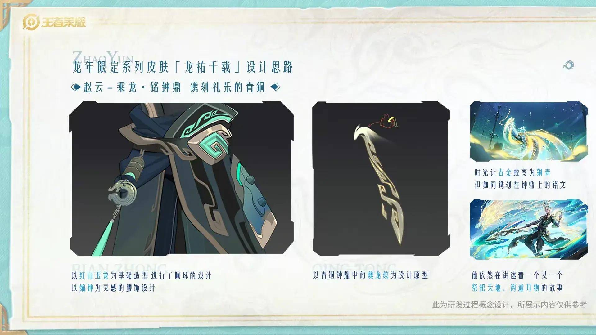 皮肤方面,赵云的龙年限定名为:“铭钟鼎”,以青铜奏响礼乐,篆刻在铜壁的铭文,在岁月的见证下吉金伴着青铜聚之为龙,龙祐天地清宁。