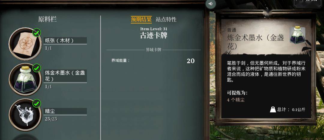而许多必备的材料环节,也都能通过战斗和探索来获得同类替代品。例如,制作用于穿梭界域的卡牌需要墨水,墨水的研制相对来说比较复杂——就像现实里一样,你要掌握研磨科技,掌握玻璃瓶的制法,还得搞到能用来做墨水的植物或者矿石原料。