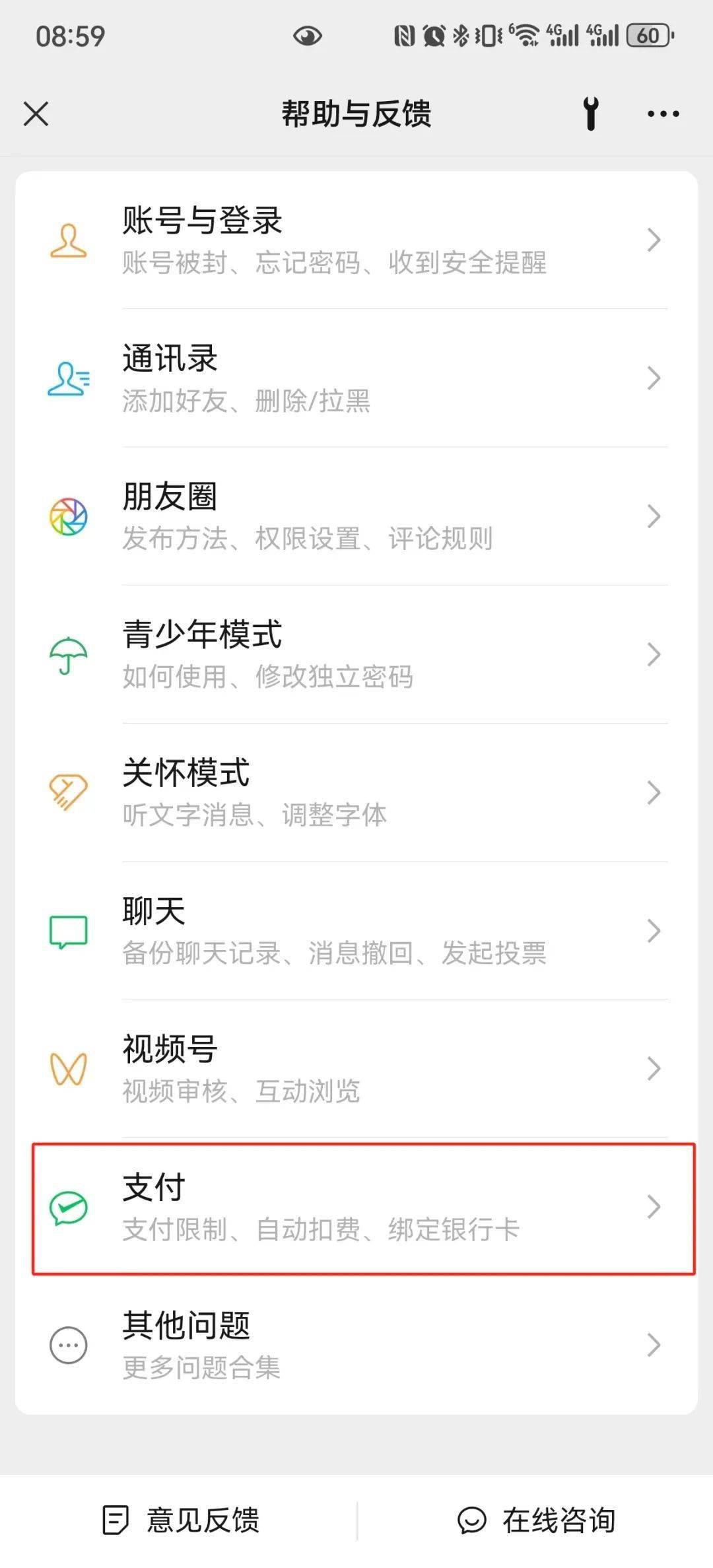 找到问题对应的类别,点击进入,再次选择对应的子类别,找到对应问题,点击进入,就可以看到微信提供的解决办法。(如:想查询“零钱通密码如何找回”问题,可依次点击“支付”——“理财管理”——“零钱通”——“转出问题”“转出资金支付密码忘记怎么办”)