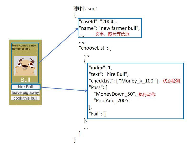 由于我们本次的功能需求与《王权》并不一致,加上 GameJam 时间有限,所以我更多凭自己的主观感受去设计事件的数据结构。其中,除了需要记录基础的图片资源和文字展示等信息,剩余最关键的,就是按下每个选择按钮之后的处理过程。而这个处理流程类似一个 if 条件语句,满足固定的条件,就执行某些动作,反之则执行其它动作。就像下图中的招聘事件,你有足够的钱就能招聘到公牛,反之则招聘失败。