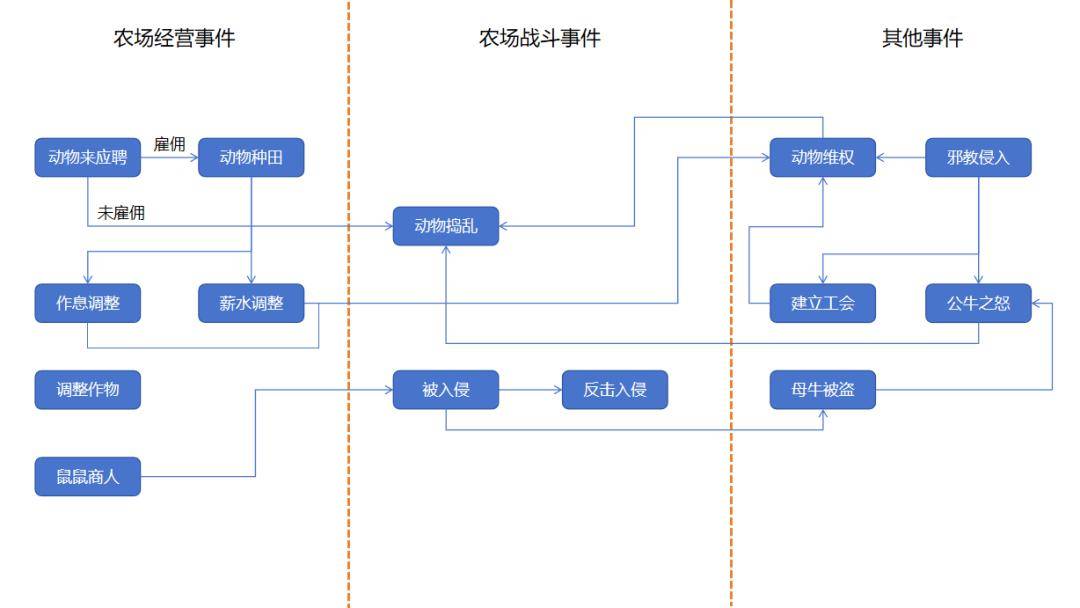 在我的期望中,对整个事件系统有着一定的复杂性追求(类似下图的脑洞,当然这牵扯到一些叙事上的设计),并且想要用上 AI 工具辅助。但由于时间紧迫和自身操作熟练度的问题,这些想法没有来得及实现。