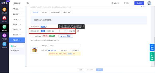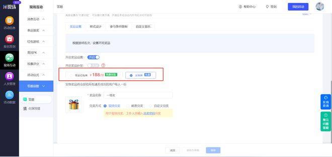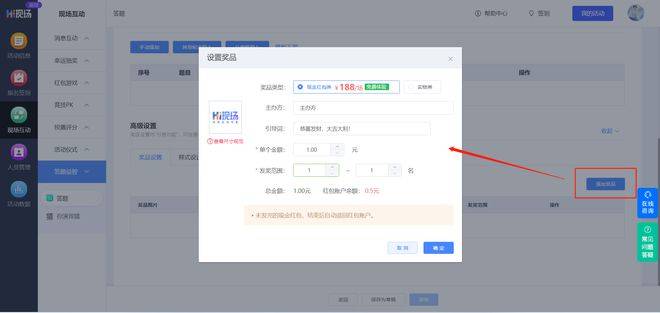积分模式:单个红包最低金额为1元 ,每轮游戏中可设置奖品发奖范围,并添加多种奖品