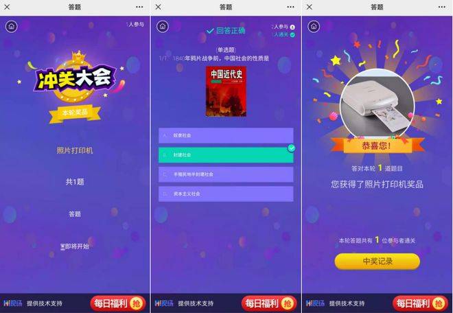 1) 如“开启奖品设置”则实物奖品将会发给所有通关成功的用户每人一份;现金红包将会平均分配给所有通
