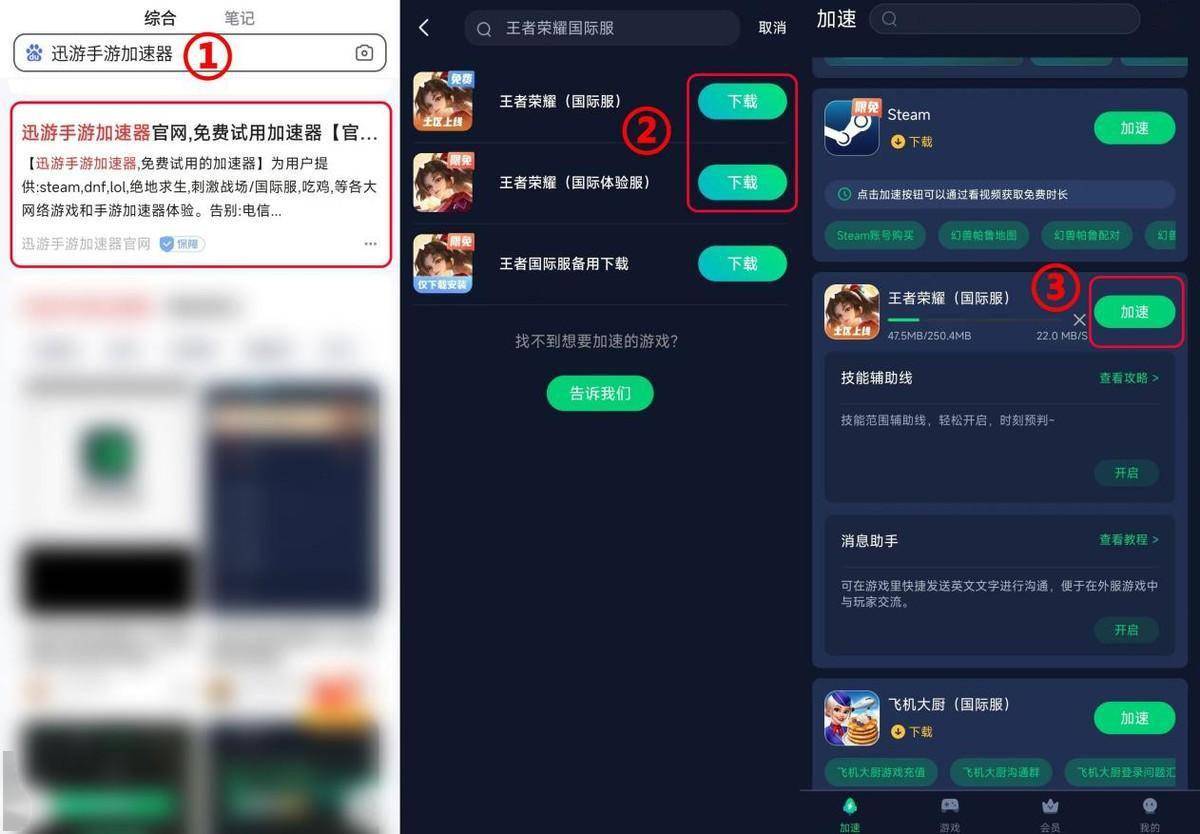 ②打开迅游手游加速器,在搜索框里查找“王者荣耀(国际服)”,即可直接下载安装。
