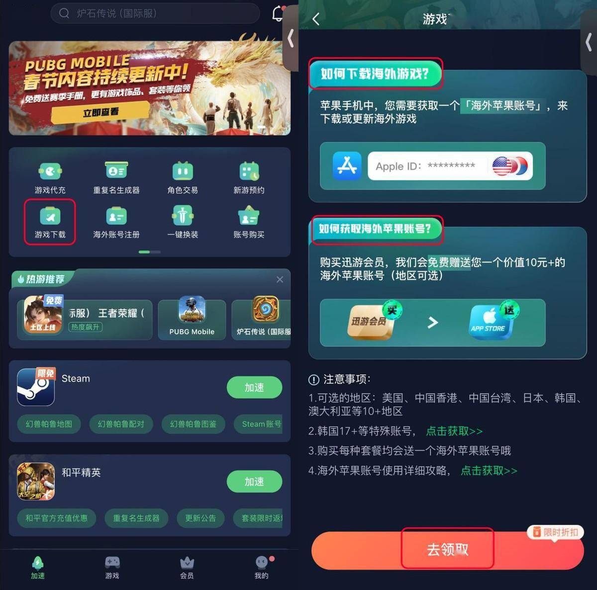 ②打开迅游手游加速器,在首页点击“游戏下载”按钮,即可跳转到“海外IOS账号”的购买界面,只需要开通任意金额的迅游手游加速器会员,就可以免费领取一个海外IOS账号,支付完成之后选择区服,即可获得独享海外ID,在APP Store切换账号之后就可以直接下载“王者荣耀(国际服)”。