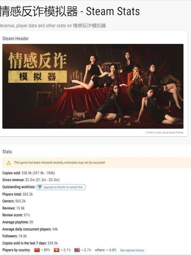 据gamalytic数据显示,目前《捞女游戏》在Steam预估销量达53.89万份,销售额破230万美元(约合人民币1653万元),Steam玩家数超56万。