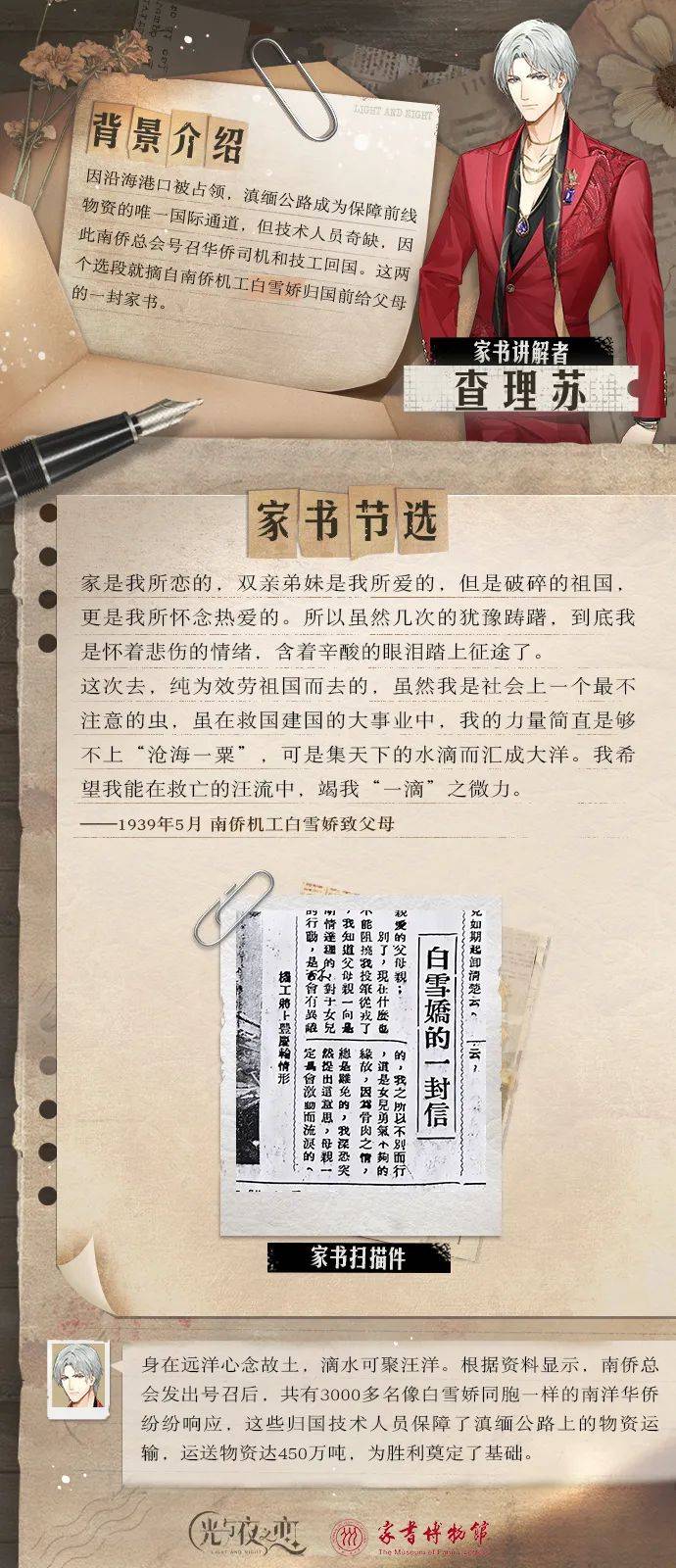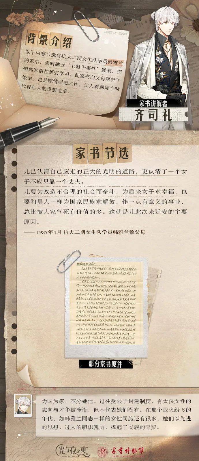 对于国人来说,这种珍爱和平、交接反侵略火种的感受,其实相当好代入和理解,毕竟列强的的确确践踏过我们生活的土地。在卡池之外,《光夜》也与中国人民大学家书博物馆合作,向玩家展示了反侵略时期的部分家书内容。