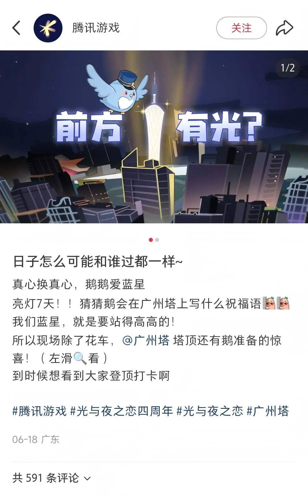 腾讯游戏在小红书、微博等社媒平台上,连发好几篇帖子为《光夜》庆生,把为《光夜》征集祝福的帖子置顶,还在广州塔准备了投屏;