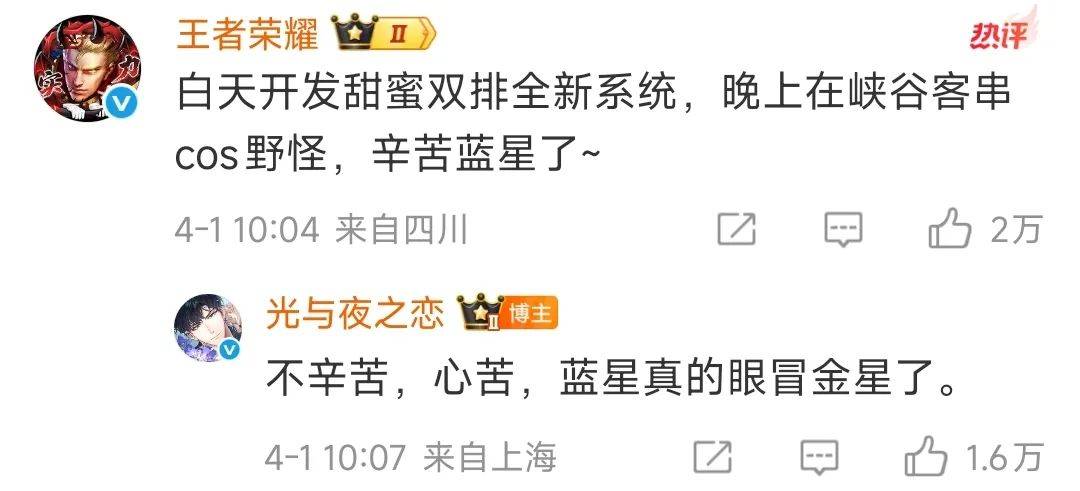 今年愚人节,《光夜》还和《王者荣耀》联手整活,预告「甜蜜双排」玩法(全是光夜和王者梗),「兄妹俩」更是在评论区甜蜜互动。
