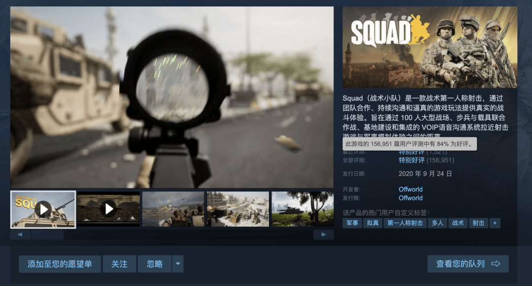 另一款腾讯代理发行的《战术小队:破晓攻势》由加拿大PC射击游戏开放商世外工作室(Offworld Industries)研发,是战术射击游戏《战术小队(Squad)》的国服版本。《战术小队》是一款“50vs50”百人同场的第一人称射击游戏,以现代战争为背景,强调团队合作、战术协同。该游戏人气与口碑极高,目前仅登陆Steam平台,整体评价为“特别好评”,好评率高达84%。需注意的是,《战术小队》目前暂无手游计划,本次获批类别也为客户端。