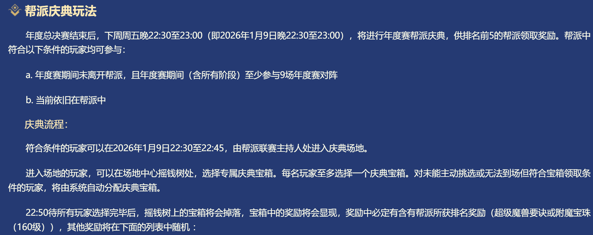 需要注意的是,帮主只有挑选超级兽诀的资格,要想获得该奖励,还需要大家参与帮派庆典玩法。不过,参与帮派庆典的前提是满足“年度赛期间未离开帮派,且年度赛期间(含所有阶段)至少参与9场年度赛对阵“和“当前依旧在帮派中”等两个条件。