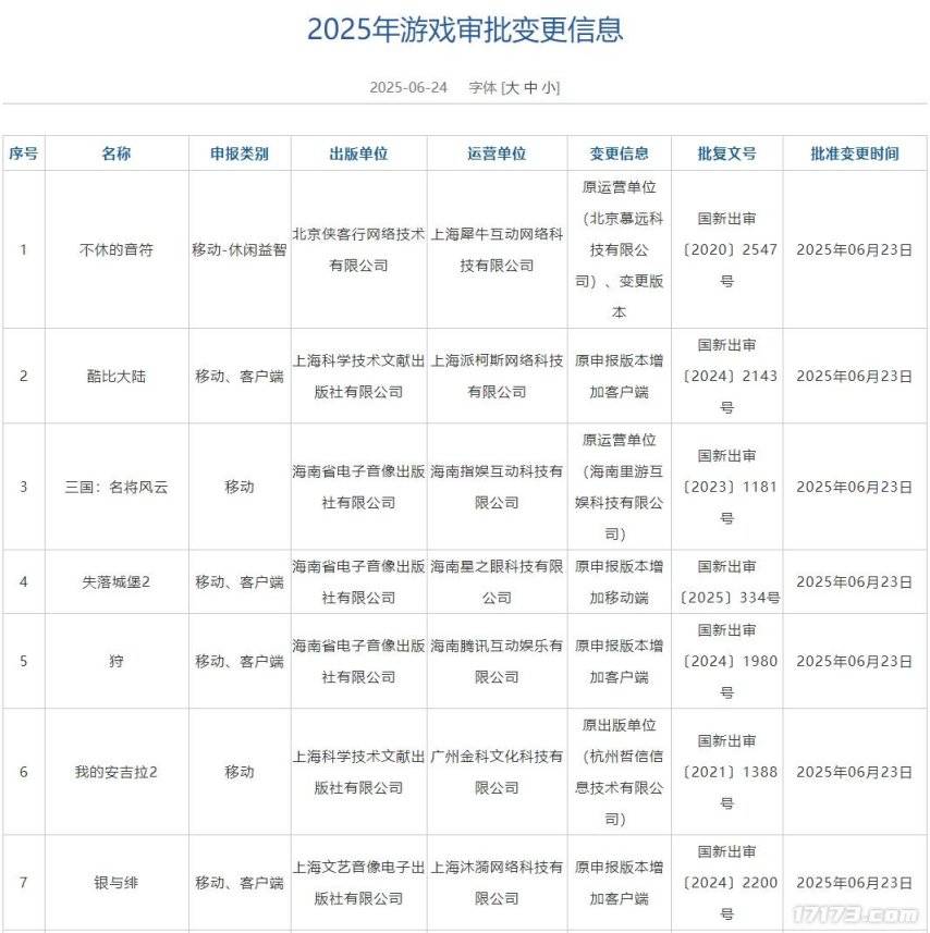 除此之外,还有7款游戏申请了审批信息变更,包括包括《狩》、《失落城堡2》《银与绯》等等。