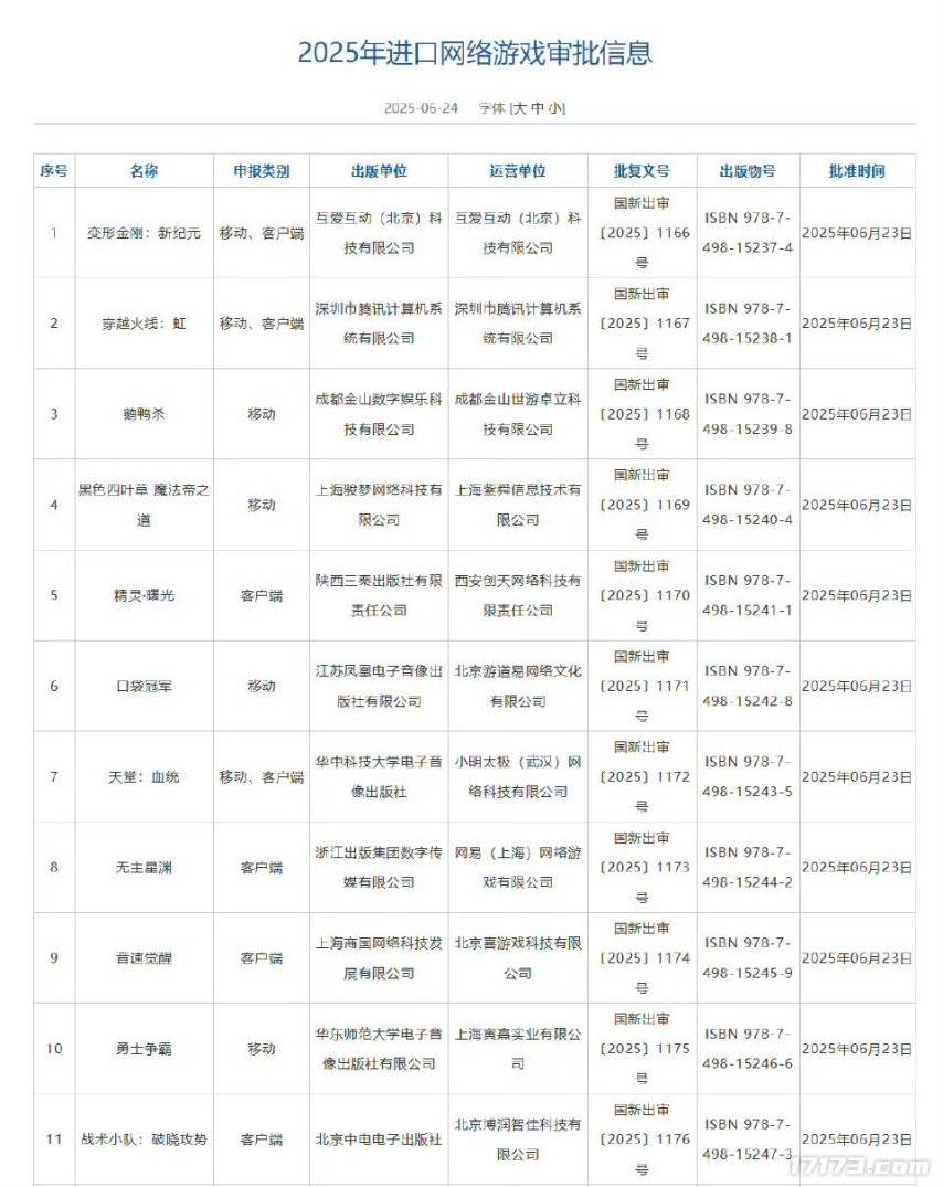 6月24日,国家新闻出版署公布了6月游戏版号审批情况,总计147款国产游戏、11款进口游戏过审,7款游戏变更信息。