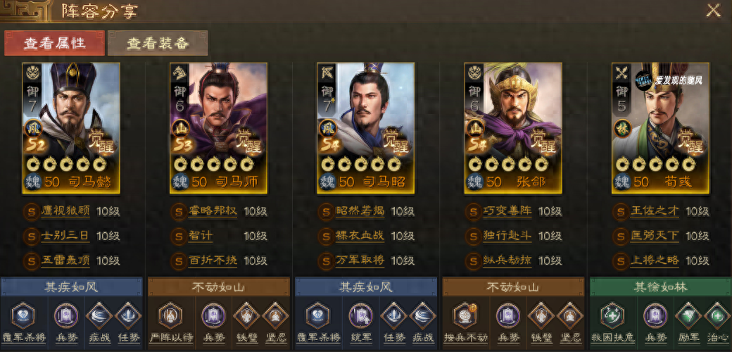 进攻性比较强的阵容组合,张郃的群体聚怪定身对于司马懿、司马昭和司马师来说均非常有意义,对于那些没有突进战法的队伍来说,想跨越张郃三马的前排相当困难。