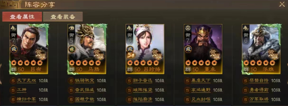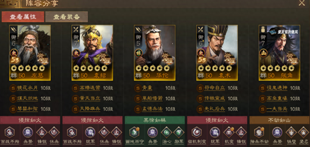 防御方面靠三个光环和华佗草船等治疗战法稳住血线。这队在红度装备相同时比较好用,天梯中也经常能见到这队挂机。原因是只要能站得住,袁术的被动就能让这队越来越强。