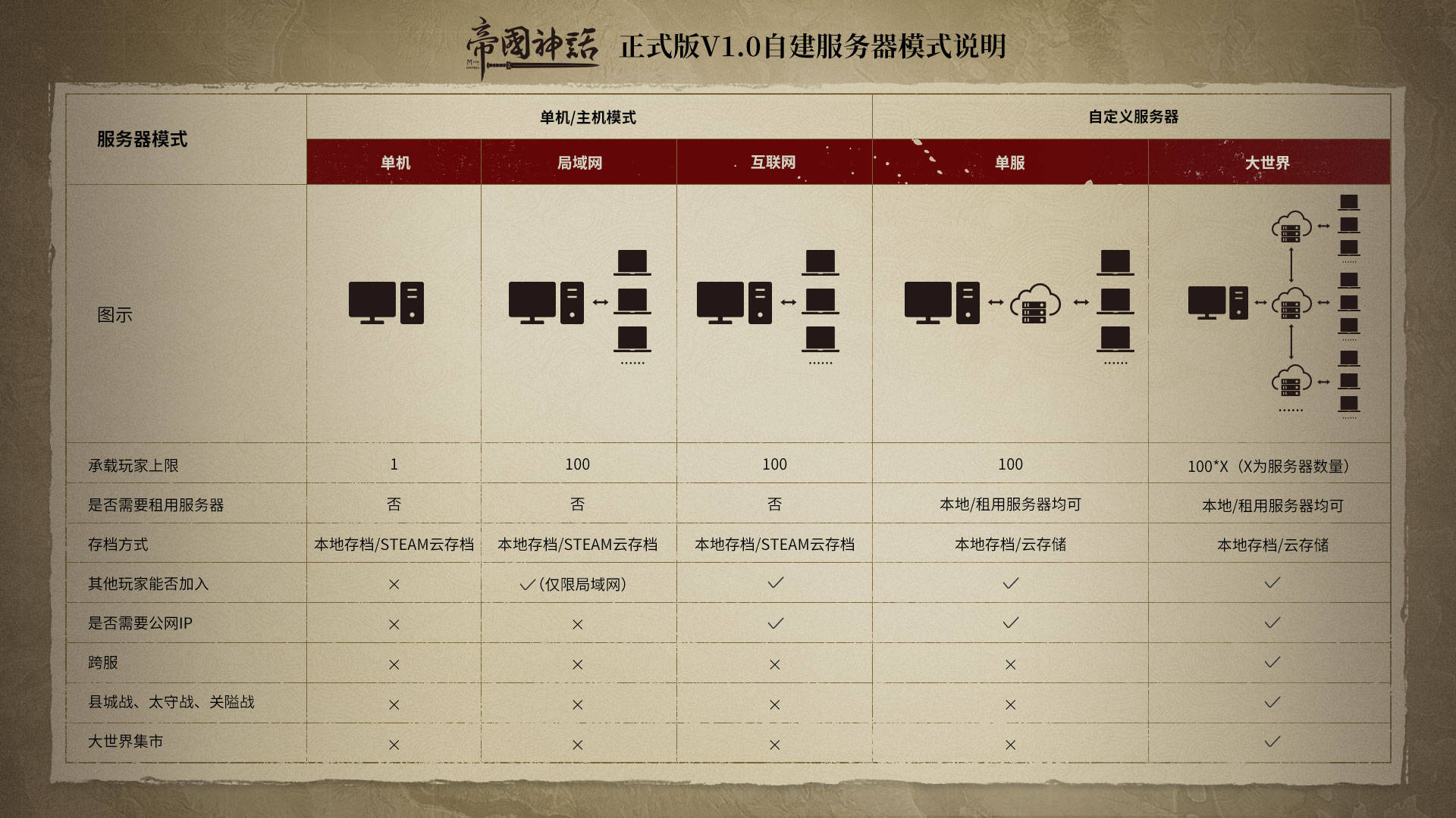 除了官方服务器外,《帝国神话》正式版V1.0还将全面支持单机、局域网、单服、大世界服务器组等5种自建服务器模式,提供更多自建选择。官方服务器还将新增大洋洲和南美服务器,以满足更多区域玩家的需求。