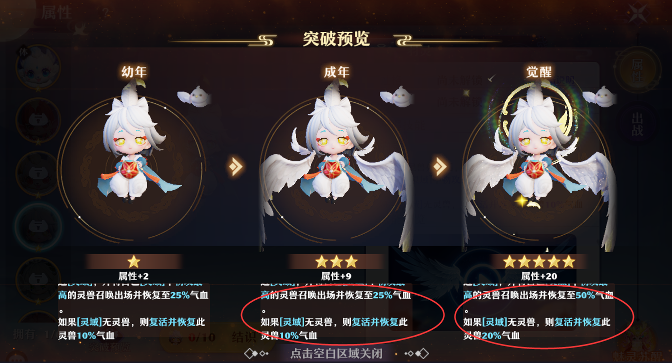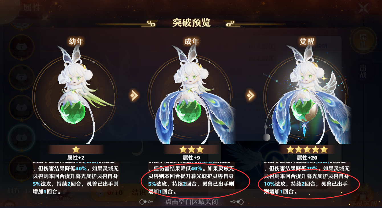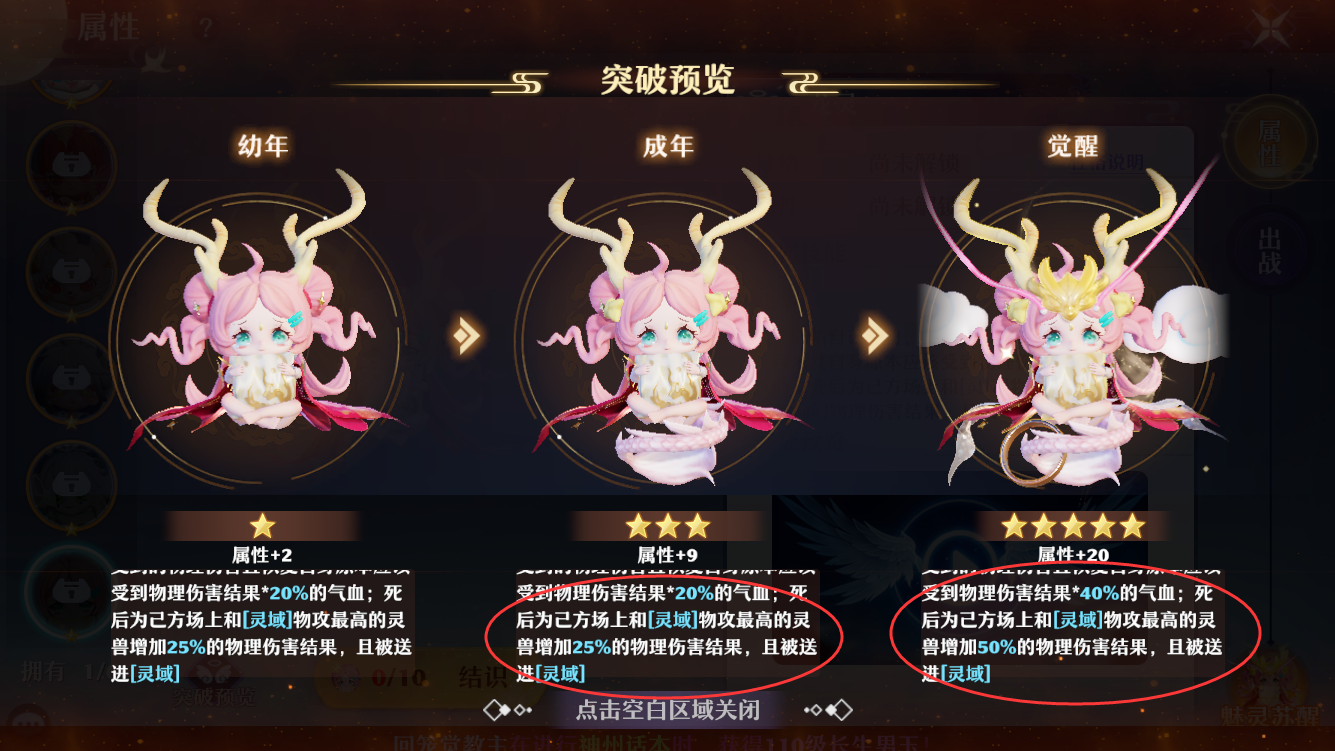 另外一点就是和别的魅灵联动,第一个就是死后可以给己方场上和灵域内物攻最高的灵兽增加物理伤害,这个可以让己方物理灵兽打出高爆发伤害,对于战局的提升还是很重要的,第二个就是死后可以进入灵域,可以确保羽灵和暮光触发进阶效果,对于整个魅灵机制的组合,能起到更稳固的作用。
