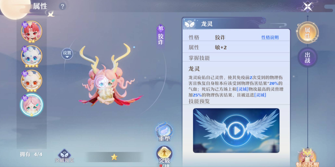 那么最受欢迎的龙灵实力如何?先来看下她的技能效果:龙灵庇佑自己灵兽,使其免疫前两次受到的物理伤害且恢复自身原本应该受到物理伤害结果的20%/20%/40%的气血,死后为己方场上和灵域物攻最高的灵兽增加25%/25%/50%的物理伤害结果,且被送进灵域。