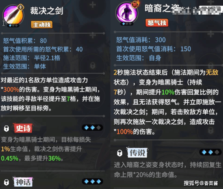 我们可以主动使用怒气技(施法时无敌,可以开技能来躲敌方的核心爆发)变身为暗黑骑士,变身期间可获得更高回血、额外爆发能力。怒气技击败单位后可再次释放,打收割特别强势。在持续作战场合我们可以通过“变身→突进→收割”来打爆发,提升至传说后,还能拥有额外生命值恢复(品质越高、回复能力越出色)。