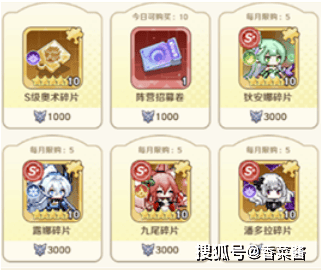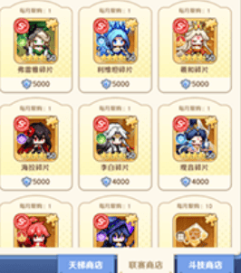 1)斗技商店:斗技场刷积分+排行获得代币,可以兑换到狄安娜,露娜,九尾,潘多拉,另外可兑换阵营招募卷。