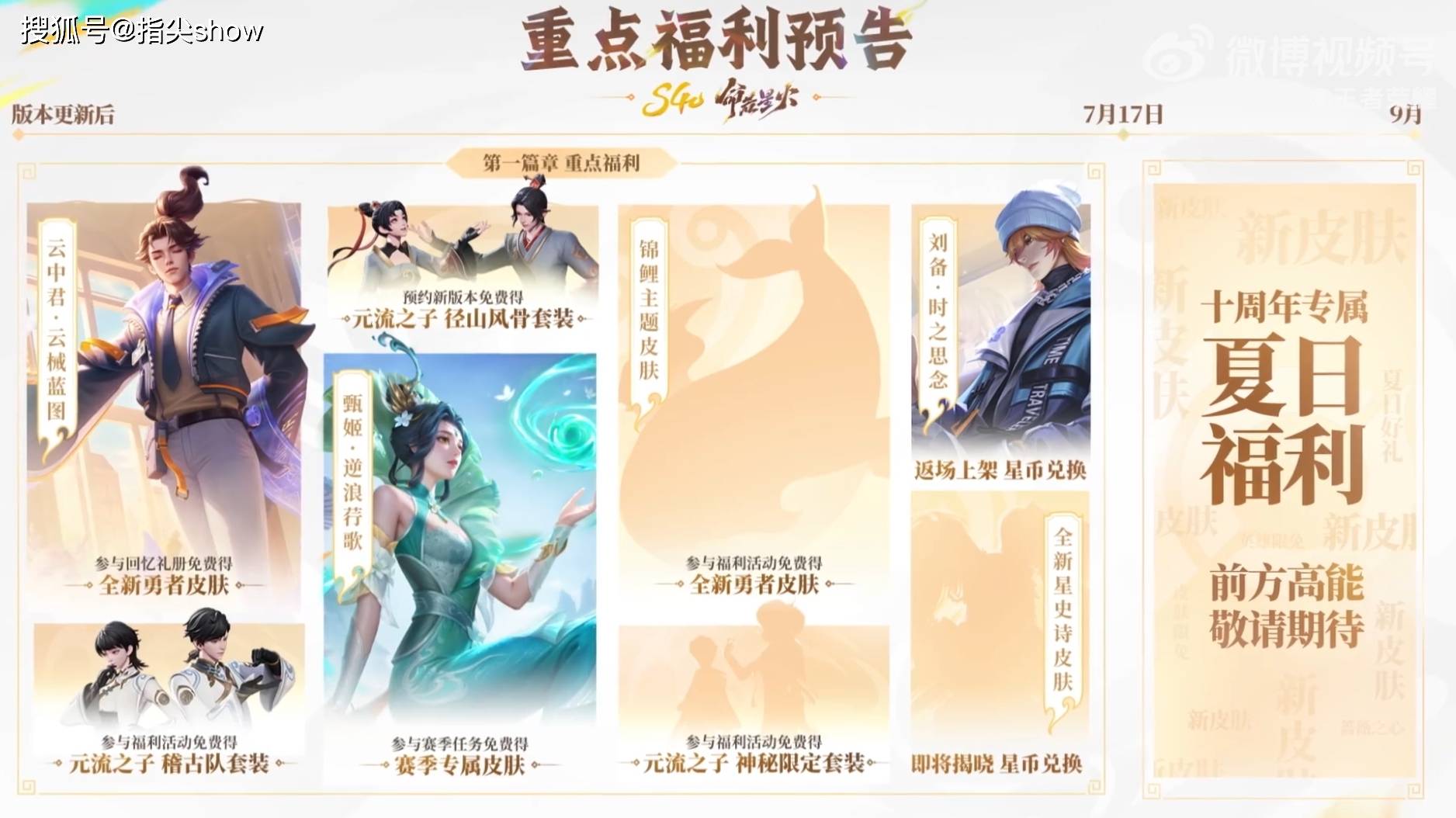 算上商城的雨龙、死霸装,加上云中君勇者和甄姬赛季皮肤,全新的锦鲤勇者皮肤,以及三套元流之子免费皮肤、星币兑换的星史诗皮肤,那就是至少九款皮肤/时装上线,且都能白嫖,刘备星传说和伽罗琥珀纪元,以及落雪白狼三款皮肤返场,这七月真的算得上皮肤雨了。