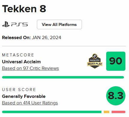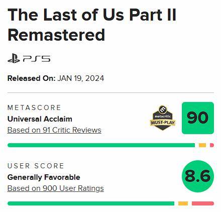 排在《最终幻想7:重生》之后的是PS5另一款游戏《最后生还者2:复刻版》。在91条评论中,它的平均得分为90分。这与《铁拳8》的得分相同,但却排在《铁拳8》之上,可能是因为它更接近91分。