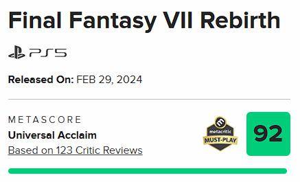 数据显示,今年到目前为止,Metacritic上评分最高的游戏是《最终幻想7:重生》,得分为92分,目前还没有在PS5上发布,游戏现在总共有123条媒体评论,全是好评,似乎说明这款游戏是今年的第一款必玩游戏。