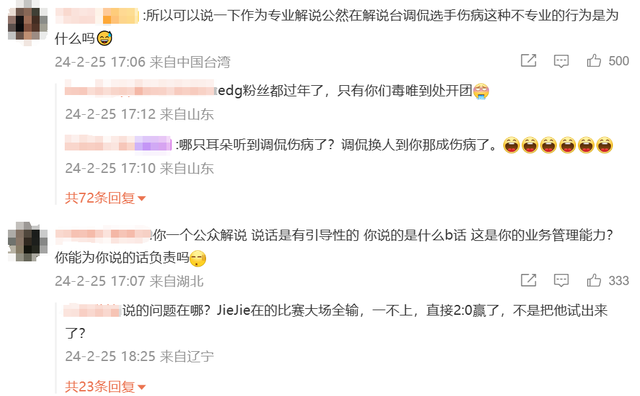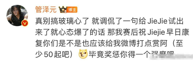 随着解说台上的这番言论引发热议,管泽元也是在赛后发博回应:“真别搞玻璃心了 就调侃了一句给 JieJie试出来了就心态爆了的话 那我赛后祝 Jiejie早日康复你们是不是也应该给我微博打点赏阿(至少50起吧),毕竟奖惩你得一个强度吧。”