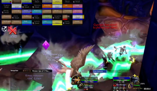 从HC Elite放出来的视频来看,Tinyviolin用小号在MT开怪的一瞬间,跑去将克苏恩的眼棱连线连到大团上,秒杀了数十名脆皮后排法师。好在指挥第一时间发现了这个货,在语音频道大喊吃化石合剂+回城,最后保住了团内剩下成员的小命。