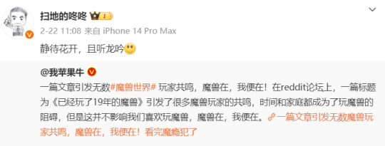 近日,部分魔兽大V都开始发布了一些怀念《魔兽世界》的消息,这也惹来了前网之易负责人张栋的关注,留下了一句:“静待花开,且听龙吟”。