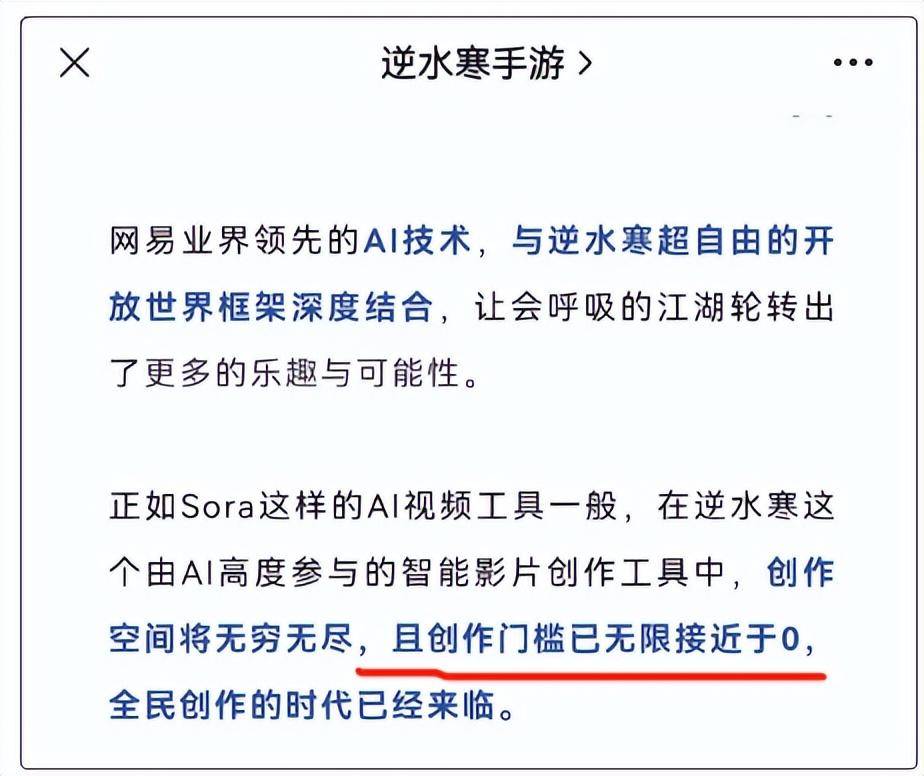 其实,《逆水寒》手游能够第一个发布“游戏版Sora”,看似是蹭流量,但其实对于他们来说,却是“水到渠成”的操作。