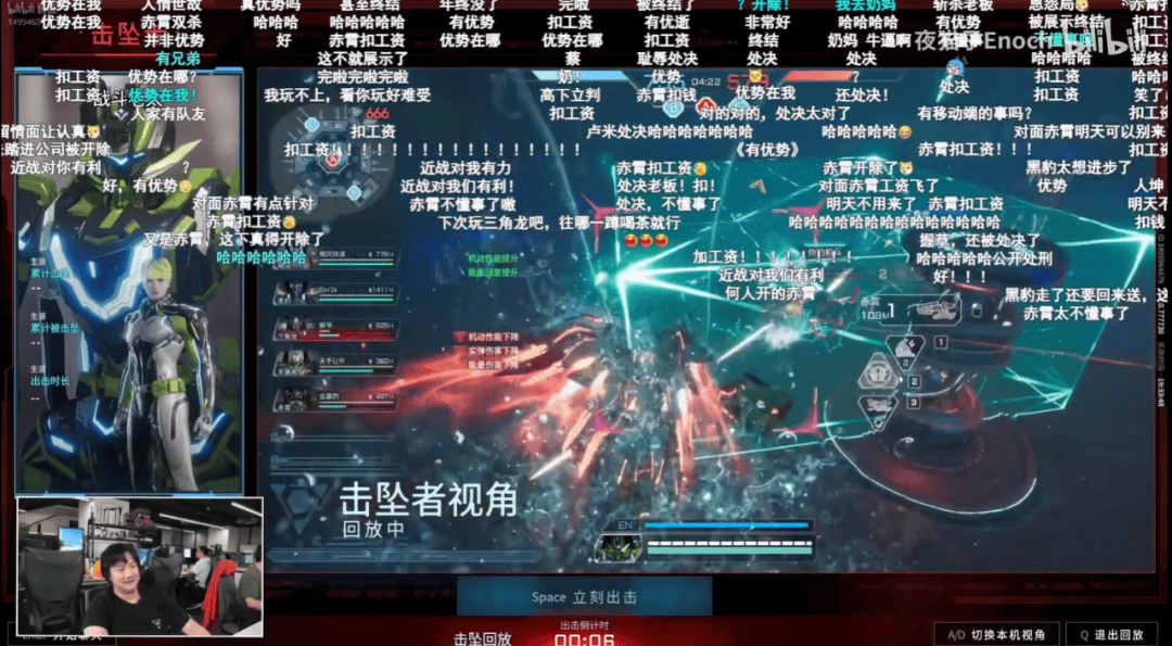 从月初SGF宣布公测消息之后到今天这不到一个月时间,郭炜炜举行了两场直播,直播形式非常“接地气”:郭炜炜坐在电脑前,边看弹幕边展示关于公测“可以公开的情报”,身后是就是《解限机》团队的工位。
