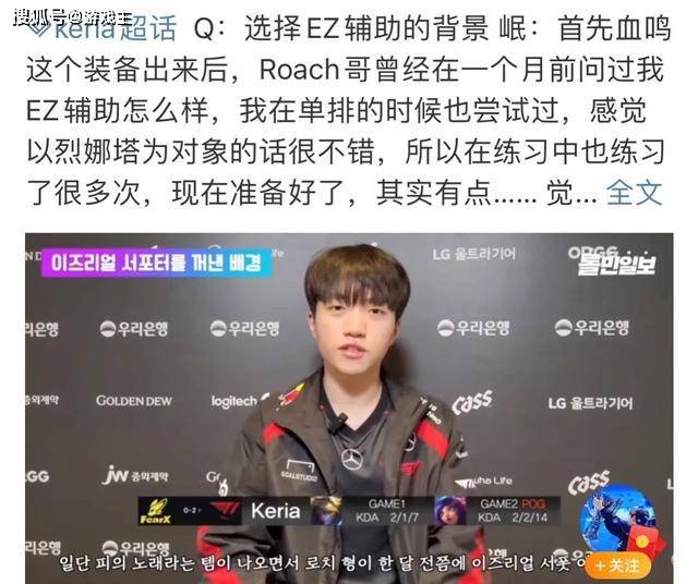 keria表示,首先血鸣这个装备出来后,Roach哥曾经在一个月前问过我EZ辅助怎么样,我在单排的时候也尝试过,感觉以烈娜塔为对象的话很不错,所以在练习中也练习了很多次,现在准备好了,其实有点…… 觉得比起别的他是更不好的,所以感觉有点放弃他的想法了,没怎么想过EZ辅助,今天gumayusi选手也是,突然很多人说让我展示一下EZ,所以我就果断的选择了EZ。
