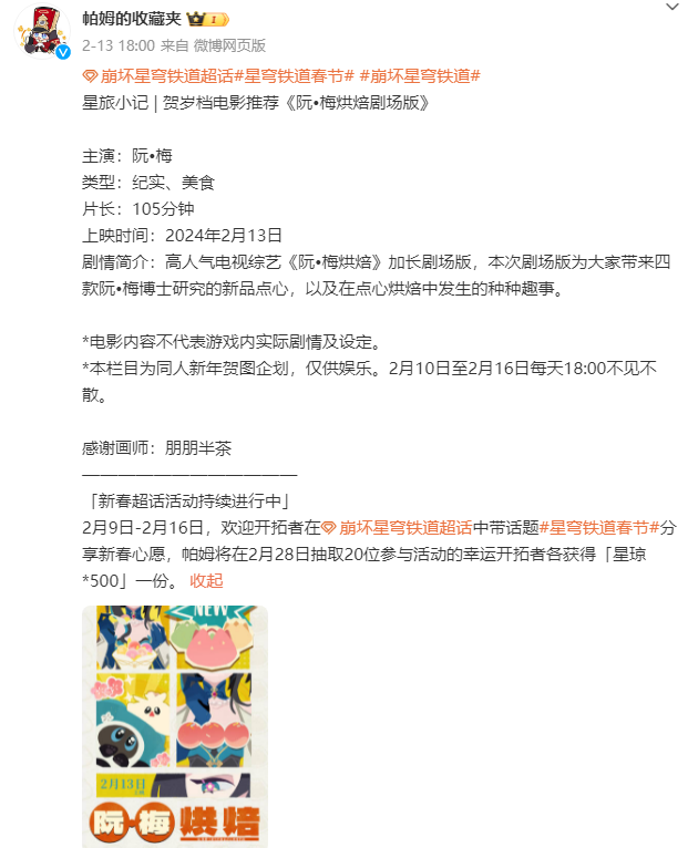 恰逢过年期间,星穹铁道的官方更是疯狂,从2月10日至2月16日每天18:00都在游戏里上映一部电影。要知道别人拍电影拍几年,星穹铁道上线不到一年的时间,就能拍出7部电影?