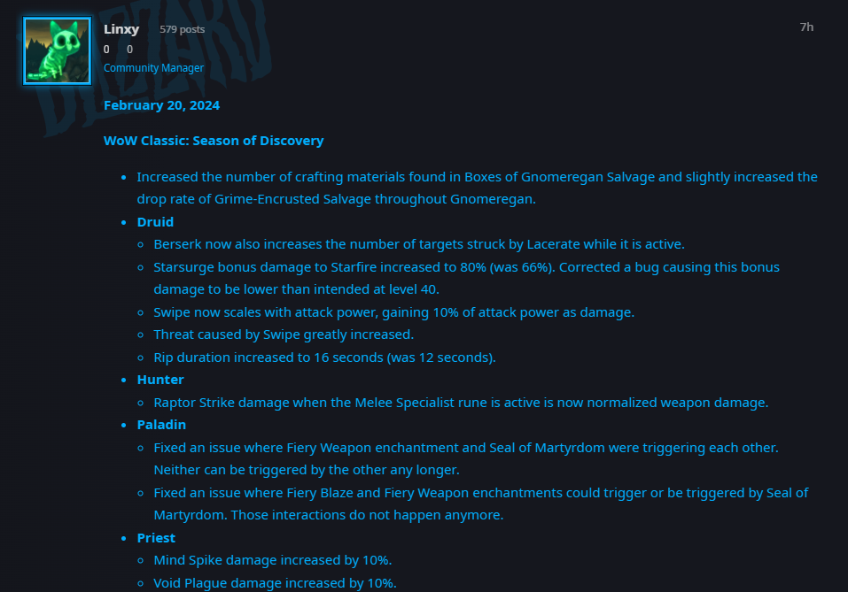 《魔兽世界》探索赛季服2月20日发布职业热修,主要是之前调整内容的更新,喜闻乐见的是,近战猎终于迎来第一刀(也有说是加强)。