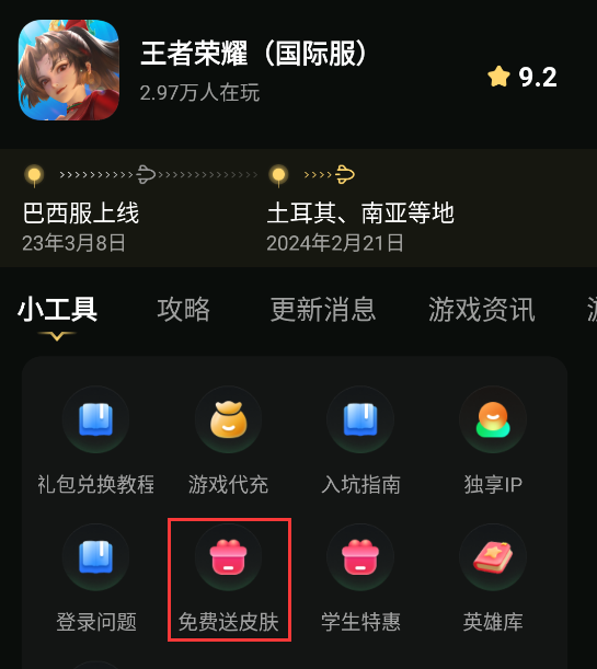作为【官方合作加速器】,奇游当然也为奇友们准备了福利!奇游内打开“王者荣耀国际服”详情页,点击【免费送皮肤】