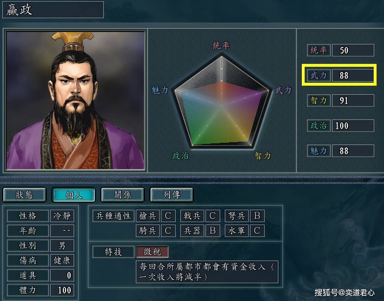 我,秦始皇,打钱!也不知道是什么原因,最近这几年只要网上有那些不着边际鼓吹某些事情的帖子,评论区里都是这个调调。三国志11游戏里的秦始皇嬴政还是有两把刷子的,他的内政水平不仅傲视所有人,智力和魅力方面同样不甘落后。扫灭六国的活儿让王翦父子帮他办了,嬴政实际的军事能力就没显示出来,武力值耐心拔擢一番,倒也还是能够跟关兴张苞比划比划。