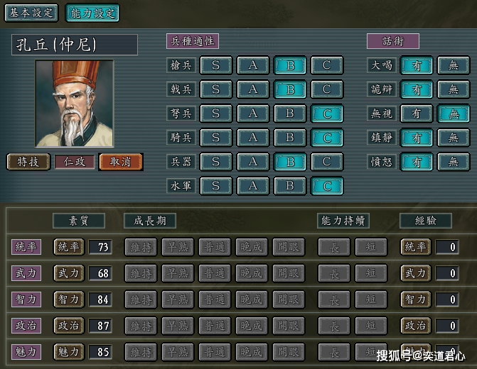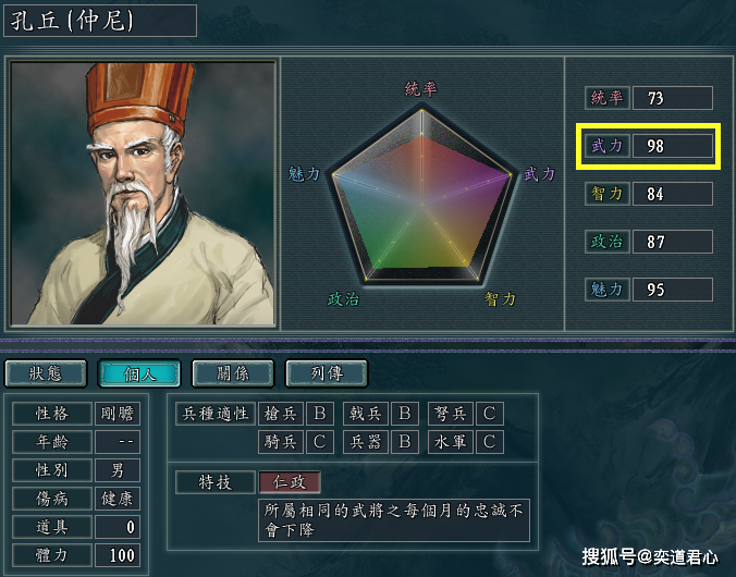 持有仁政特技的孔子,也是个饱满圆润的五星级战士,按照三国志11游戏30点的能力培养极限来看,他理论最高是可以跟张飞持平的。枪、戟和器械三项也能比较从容的从B级升到A,身高2米的彪形大汉,就算再不会武功,用体重都能把对方压死了吧!