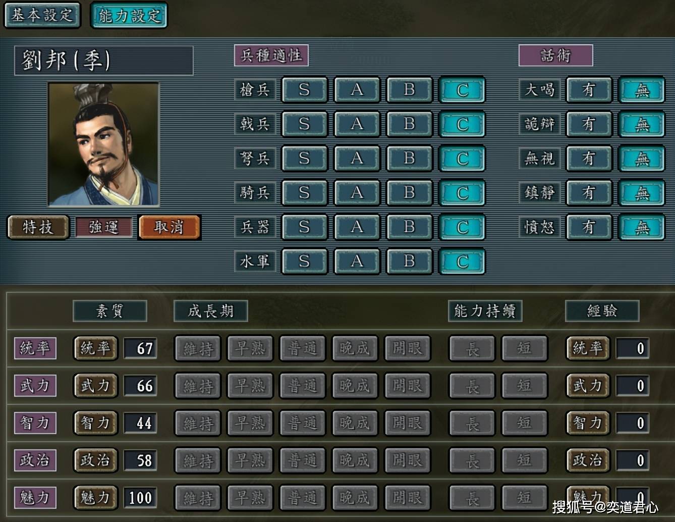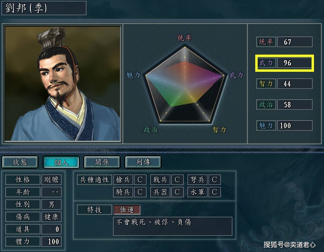西汉帝国的开创者刘邦,初始武力值66点,比蜀汉开国者刘备稍低一些,可培养到极限的话,依旧可以达到96点的超高水准,与赵云、许褚在账面上是持平的。更为亮眼的是,刘邦在游戏里的默认特技是强运,要是不想花心思培养他,安排他去做个点炸药的火头兵也是个不错的选择。