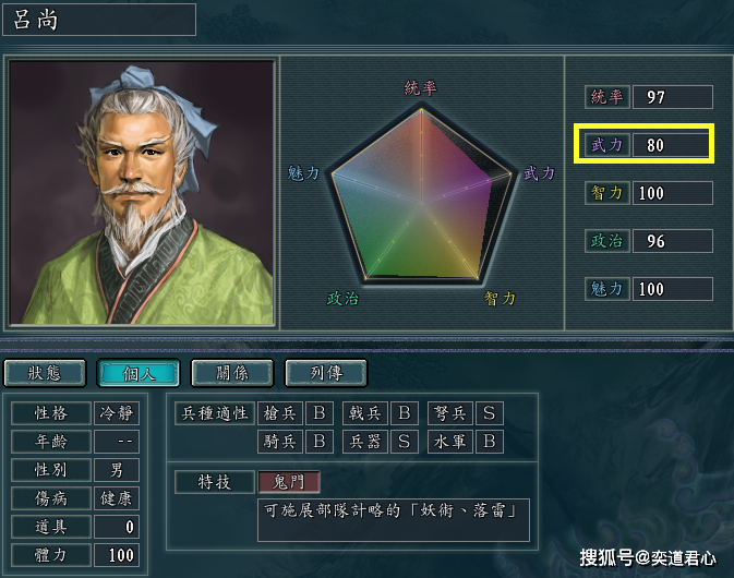 同样都是100点智力,姜子牙这个功夫水平,至少比诸葛亮的底子好吧!如果条件允许,把姜子牙砸到80点武力值,他就是整部三国志11最完美的男人。庞统可以脱团了,让诸葛亮、马谡跟姜子牙组队,神白鬼一旦携手,当真是雷劈天下无敌手。